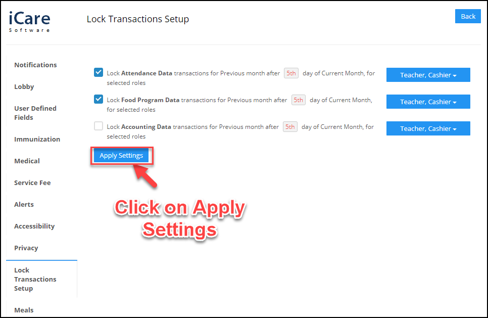 In iCare, a new feature has been introduced for locking(editing/deleting the data is denied) under the Attendance Data, Food Program Data, Accounting data for specific user roles.